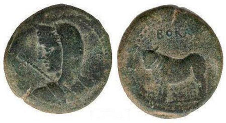 Keywords: Moneda-bora.jpg Fotografía de una moneda ibérica de la ceca de Bora PD-old History of the province of Jaén Languages of Pre-Roman Iberia Iberian coins bulls on coins Mint of Bora