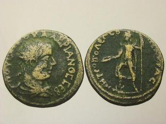 Keywords: Moneta Ancyry (Walerian I).jpeg Ankyra coin of Valerian I obv rev with Mên as the patron deity of the city holding patera and sceptre foot on bucranium bull's skull own 2014-01-30 Cyborian użytkownik Greek imperial coins Coins of Valerianus I |