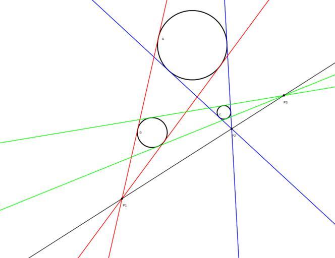 Keywords: Monge theorem.svg en This image illustrates Monge's Theorem that says that given three arbitrary circles A B and C none of which is inside one of the others the three sets of external tangents determine three collinear points P1 P2 and P3 pl Ten obraz ilustruje twierdzenie Monge'a które mówi że dane trzy dowolne okręgi A B i C z których żaden z nich nie jest w środku jednego z pozostałych trzy komplety stycznych zewnętrznych określają trzy współliniowe punkty P1 P2 i P3 es Esta imagen ilustra el teorema de Monge que dice que dado tres círculos arbitrarios A B y C ninguno de los cuales está dentro de una de las otras los tres conjuntos de tangentes externas determinar tres puntos colineales P1 P2 y P3 own using the program KSeg Jason Quinn 2010-08-26 Geometry diagrams SVG mathematics Theorems in geometry |