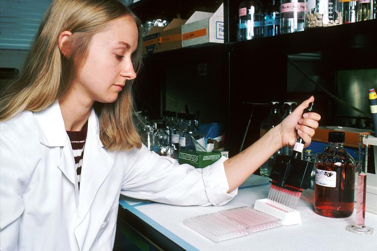 | Keywords: Monoclonal antibodies (1).jpg A Caucasian female laboratory technician filling wells with a liquid for a research test This researcher is involved in preparation of cultures in which hybrids are grown in large quantities to produce a desired antibody This is effected by fusing myeloma cell and mouse b-lymphocyte to form hybrid cell hybridoma Topics/Categories People -- Adult People -- Health Professional Science and Technology -- Laboratory Techniques/Equipment Type Color Photo Source National Cancer Institute Linda Bartlett Photographer 2012 1980 Reuse Restrictions None - This image is in the public domain and can be freely reused Please credit the source and/or author listed above Linda Bartlett Photographer PD-USGov-HHS-NIH Media from National Cancer Institute Visuals Online Images uploaded by Fæ Monoclonal antibodies People with lab coats People using pipettes |