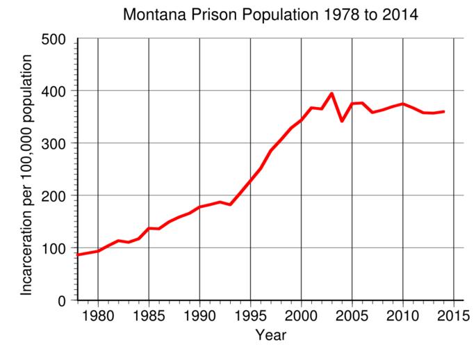 Keywords: Montana Prison Population.svg en Montana prison incarceration rate per 100 000 population from 1978 to 2014 Data from http //www bjs gov/index cfm ty nps BJS 2016-05-11 own Delphi234 other versions current annually Generated with Wikimedia SVG Chart SVG Chart/box cc-zero Prisons in Montana Imprisonment and detention rates in the United States |