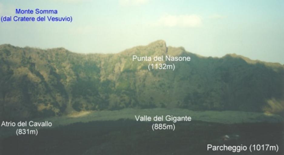 Keywords: Monte Somma descritto.JPG it Il Monte Somma ripreso dalla cima del Vesuvio Si nota la Punta del Nasone il punto più alto del Monte Somma 1 132 m s l m che prende il nome dalla somiglianza con il profilo di un volto disteso lungo la cresta del monte own Lobufalo Vesuvius volcano Panoramics of volcanoes |
