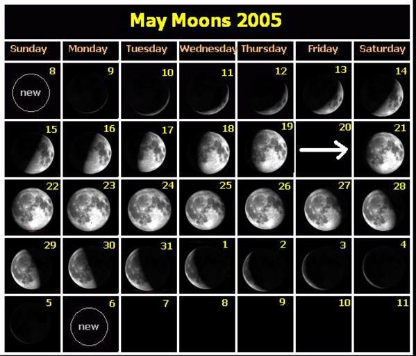 MAKE A MEME View Large Image Moon phase calendar 2005.png Example calendar showing lunar phases This sequence shows the moon each day from an assumed latitude of 45 north and pictures taken approximately 25 minutes later every day The 25 minute shift was picked to ...