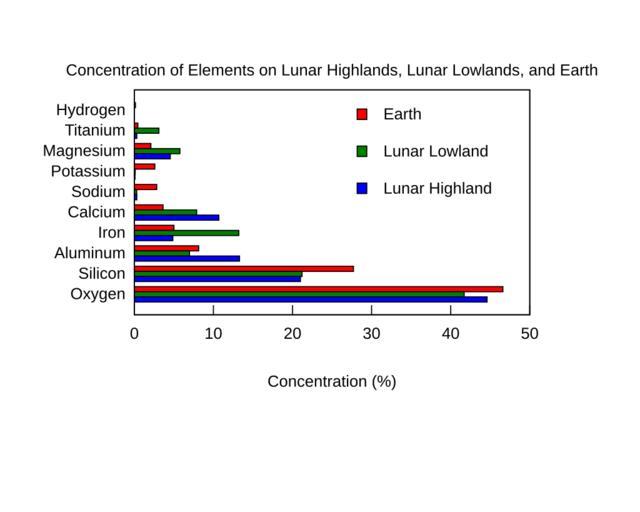Keywords: Moon vs earth composition.svg en Relative Concentration of Various Important Elements on Lunar Highlands Lunar Lowlands and Earth Data Source http //www permanent com/l-apollo htm own Roger wilco 2010-07-08 File Moon_VS_Earth_Composition JPG File Mond - Erde Elementanteile svg set y2label Concentration set yrange 0 50 set y2range 0 50 set ylabel 'Concentration of Elements on Lunar Highlands Lunar Lowlands and Earth' set key at graph 0 5 0 60 horizontal samplen 0 1 set label 1 'Earth' at graph 0 11 0 63 left rotate by 90 set label 2 'Lunar Lowland' at graph 0 275 0 63 left rotate by 90 set label 3 'Lunar Highland' at graph 0 44 0 63 left rotate by 90 set size ratio 2 set term svg set output 'wiki svg' plot '-' using 2/10000 xtic 1 title ' ' \ '-' using 1/10000 title ' ' \ '-' using 1/10000 title ' ' Hydrogen 1400 Titanium 4400 Magnesium 20900 Potassium 25900 Sodium 28300 Calcium 36300 Iron 50000 Aluminum 81300 Silicon 277000 Oxygen 466000 e 54 31000 57600 1100 2900 78800 132000 69700 212000 417000 e 56 3100 45500 800 3100 106800 48700 133000 210000 446000 e Moon diagrams |