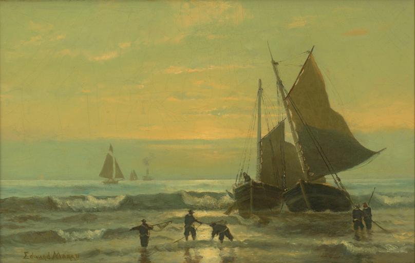 Keywords: Moran Fishing Boats at Sunset.jpg Fishing Boats at Sunset Oil on canvas 16 x 24 inches http //www treadwaygallery com/ONLINECATALOGS/December2005/catalog/0501-0600 html ca 1870 Edward Moran PD PD-Art Fishing boats in art Waves in art Edward Moran Paintings of seascapes with sunset Sailboats at sunset |