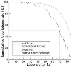 Keywords: Morbus Fabry survival female.svg Die kumulative à berlebensrate von weiblichen Morbus-Fabry-Patienten im Vergleich zur weiblichen Gesamtbevölkerung own work data taken from K D MacDermot A Holmes A H Miners Anderson-Fabry disease clinical manifestations and impact of disease in a cohort of 60 obligate carrier females In Journal of medical genetics Band 38 Nummer 11 November 2001 pp 769 “775 1468-6244 PMID 11732485 173475 2011-09-03 Kuebi Armin Kübelbeck Cc-zero Fabry disease |