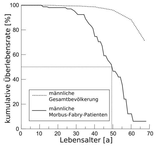 Keywords: Morbus Fabry survival male.svg Die kumulative à berlebensrate von männlichen Morbus-Fabry-Patienten im Vergleich zur männlichen Gesamtbevölkerung own work data taken from K D MacDermot A Holmes A H Miners Anderson-Fabry disease clinical manifestations and impact of disease in a cohort of 98 hemizygous males In Journal of medical genetics Volume 38 Number 11 November 2001 pp 750 “760 ISSN 1468-6244 PMID 11694547 PMC 173476 2011-09-03 Kuebi Armin Kübelbeck Cc-zero Fabry disease |