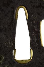 Keywords: Morikawa Toshikage - Tsuba with Stone Rabbit with a Blossoming Plum Branch - Walters 51371 - Mark B.jpg On the right of this tsuba is a stone rabbit with a branch of plum blossoms in its back Two birds fly over the central opening A stream is shown at the lower left Rabbits are one of the zodiac animals and often depicted in Japanese art On the reverse are a pine branch by a river and a full moon at the upper right 1864 late Edo iron gilt gold silver cm 6 8 accession number 51 371 20775 Henry Walters Baltimore date and mode of acquisition unknown Walters Art Museum Henry Walters Acquired by Henry Walters Signature Hôshinsai/Toshikage; Date Genji ki-no-e ne chûshû/ kao ; Translation Mid-autumn Genji year of the rat 1864 place of origin Edo present-day Tokyo Japan Walters Art Museum license Tosogu Japanese sword fittings in the Walters Art Museum Morikawa Toshikage Media contributed by the Walters Art Museum needs category review |