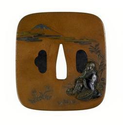 | Keywords: Morimura Atsutaka - Tsuba with Saigyô Gazing at Mt Fuji - Walters 51136.jpg Seated at the lower left of the tsuba is the 12th-century monk Saigyô Saigyô was a palace guard who became a Buddhist monk at the age of twenty three when the Emperor Toba abdicated and became a monk Saigyô wandered the country until he died in Kyoto at the age of seventy three Here he is shown gazing at Mt Fuji which is shown on the upper left of the tsuba Saigyô's traveling hat rests beside him The reverse of the tsuba shows pine trees and birds The holes for the utility knife and hair pick are indicated in the background but do not appear to have actually been cut through the tsuba middle Other date century 19 Edo copper shibuichi silver gold shakudo cm 7 65 7 0 48 accession number 51 136 8898 Henry Walters Baltimore date and mode of acquisition unknown Walters Art Museum Henry Walters Acquired by Henry Walters Signature Morimura Atsutaka kao place of origin Edo present-day Tokyo Japan Walters Art Museum license Tosogu Japanese sword fittings in the Walters Art Museum Morimura Atsutaka Media contributed by the Walters Art Museum needs category review |