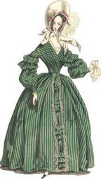 Keywords: MORNING DRESS Pelisse robe of striped silk.jpg The World of Fashion; February 1838 MORNING DRESS Fig 2--Pelisse robe of striped silk; it is of two shades of green a dead and bright stripe alternately ; the front of the skirt is trimmed in a very novel manner with black lace and coques and bands of green ribbon High corsage partially open in the front and disposed in folds Sleeves demi-large White rep velvet hat a long oval brim delicately trimmed with flowers ; a bouquet of saules marabous adorns the crown PD-Art Fashion in 1838 Velvet in art Flower-adorned hats in art Morning dresses Female pelisses Artworks missing infobox template |