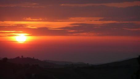 Keywords: morning sky orange sunlight sunshine shining star bright cloudy dark silhouette countryside buildings hills mountains trees horizon