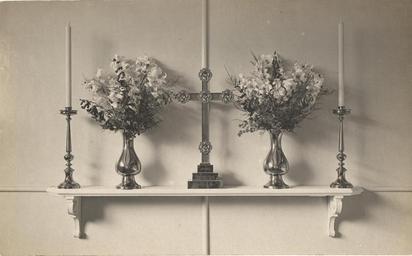 Keywords: hospital king george military hospital kinggeorgemilitaryhospital postcards national library of medicine nationallibraryofmedicine monochrome Contributor(s): Zwerdling, Michael, former owner Publication: [England] : [publisher not identified], [1915] Language(s): English Format: Still image Subject(s): Hospitals, Military Alexandra, Queen, consort of Edward VII, King of Great Britain, 1844-1925. Victoria, Princess, 1868 -1935. King George Military Hospital. Genre(s): Postcards Abstract: Black and white photograph of the altar in the mortuary chapel in King George Military Hospital, London, England. On the altar sits two candlesticks from Queen Victoria and a brass cross and two brass vases (with flowers) from Queen Alexandra. The cross is decorated with moonstones and is inscribed on its base with the words "Jesus calls, now comes peace." Extent: 1 postcard : 9 x 14 cm Provenance: Purchase ; Michael Zwerdling ; 2004 ; 04-22. Technique: black and white NLM Unique ID: 101610950 NLM Image ID: D05765 Permanent Link: resource.nlm.nih.gov/101610950 Contributor(s): Zwerdling, Michael, former owner Publication: [England] : [publisher not identified], [1915] Language(s): English Format: Still image Subject(s): Hospitals, Military Alexandra, Queen, consort of Edward VII, King of Great Britain, 1844-1925. Victoria, Princess, 1868 -1935. King George Military Hospital. Genre(s): Postcards Abstract: Black and white photograph of the altar in the mortuary chapel in King George Military Hospital, London, England. On the altar sits two candlesticks from Queen Victoria and a brass cross and two brass vases (with flowers) from Queen Alexandra. The cross is decorated with moonstones and is inscribed on its base with the words "Jesus calls, now comes peace." Extent: 1 postcard : 9 x 14 cm Provenance: Purchase ; Michael Zwerdling ; 2004 ; 04-22. Technique: black and white NLM Unique ID: 101610950 NLM Image ID: D05765 Permanent Link: resource.nlm.nih.gov/101610950 |