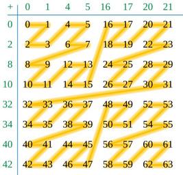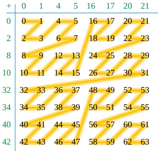 Keywords: Moser–de Bruijn addition.svg Moser “de Bruijn sequence and the Z-order curve formed by connecting the sums in numerical order 2016-11-17 own David Eppstein other versions cc-zero Number theory Z-order curves
