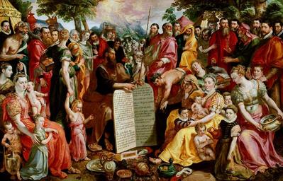 Keywords: Moses Showing the Tablets of the Law to the Israelites, with Portraits of Members of the Panhuys Family, their Relatives and Friends by Maerten de Vos Museum Catharijneconvent RMCC s94.jpg Artwork creator Maerten de Vos - 1574 1575 ucfirst oil on panel cm 153 273 5 institution Museum Catharijneconvent not on view place of discovery object history by 1835 jonkheer Pieter van Panhuys 1757-1835 Leiden ProvenanceEvent 1836 bequest LangSwitch die the au het Mauritshuis The Hague The Hague 249 jonkheer Pieter van Panhuys Leiden Leiden ProvenanceEvent 1982 loan LangSwitch das the au het Museum Catharijneconvent Utrecht RMCC s94 LangSwitch die the le het Mauritshuis The Hague The Hague exhibition history credit line PEETER PANHVYS ÆTATIS SVÆ · 46 · name and age of sitter center right la Op de omslagmantel van de staande man tweede van rechts PEETER PANHVYS / ÆTATIS / SVÆ · 8 · 157 name and age of sitter / date center right la Op de linkermouw van het jongetje voor hem MARGARITA PANHVYS ÆTATIS / SVÆ · 30 1575· name and age of sitter / date bottom right la Op het bovenlijfje van de jurk van de zittende vrouw GIELIS PANHVYS AN· 157 name and age of sitter / date bottom right la Op de luier van de baby op haar schoot BARTHOLOMEVS / PANHVYS · Æ / 4· AN 1575 name and age of sitter / date bottom right la Op de rechtermouw van het jongetje leunend tegen haar knie MARGARITA / PANHVYS · Æ / · 6 · ANo 1574 name and age of sitter / date bottom right la Op de rechtermouw van het staande meisje achter haar ANNA PANHVYS · Æ · 10 · 157 name and age of sitter / date bottom right la Op de kan in de rechterhand van het geknielde meisje op de voorgrond SR i18n/or SK unit ~ Op één van de munten in de schaal middenvoor Ick bē die Heere v Godt / Die v wt eghipten lant / wt dē dienſthuyſe hebbe / Gheleydt ghy en ſult gheen / ander ghodē hebbē neffens / my ghy en ſult v gheē beeldē / noch enighe ghelykeniſſe / makē van tgene dat bouen / indē hemel is noch van / datter op die aerde is of / vā datter inder wateren / is onder der aerden en aen / bidtſe noch en diētse niet / want ick die Heere v Godt / ben ·8c· / Ghy en ſult den naem des / Heeren uws Godts niet / te vergeefs ghebruyken / 8c· / Syt gedachtich den / ſebaoth dagh dat ghy diē / heylicht ſes dagen ſuldy / aerbeyden en al v werck / doen maer dē ſeuenſten / is den ſebaoth des Heerē / UWS Gods ·8c· // Ghy ſult vader ē moeder / eeren op dat ghy langhe / Leeft inden lande dat v die / Heere v Godt geuen ſal / Ghy en ſult niet Dooden / Ghy en ſult gheen ouerſpel / doen / Ghy en ſult niet stelen / Ghy en ſult gheen valſche / getuyghenisse geuen / tegen dynen naeſten / Ghy en ſult niet begeeren / uws naeſten huys / Ghy en ſult niet begeeren / uws naeſten wyf noch / ſynen knecht noch iong / wyf noch osse noch / eſel noch enige dinghē / dat hy heeft / Exodi · XX text center odt Op de Tafelen der Wet accession number RMCC s94 place of creation Antwerp www mauritshuis nl https //www mauritshuis nl Home https //www mauritshuis nl/en/explore/the-collection/artworks/moses-showing-the-tablets-of-the-law-to-the-israelites-with-portraits-of-members-of-the-panhuys-family-their-relatives-and-friends-249/detailgegevens/ Info https //www mauritshuis nl/-/media/9c155c58e03c400ea3a57fa4635e6d61 ashx Pic MCC-39982 Mozes met de tafelen der wet te midden van Israëlieten als 'portraits historiés' verbeeld door de Antwerpse familie Panhuys met verwanten en vrienden 1 tif Version with frame from www catharijneconvent nl Maerten de vos mosè con le tavole della legge 1574-75 01 jpg Version with frame by Wikimedia Commons 39982 Mozes met de tafelen der wet te midden van Israëlieten als 'portraits historiés' verbeeld door de Antwerpse familie Panhuys met verwanten en vrienden mozes-toont-de-tafelen-der-wet-aan-de-isralieten-met-portretten-van-leden-van-de-familie-panhuys-hun-verwanten-en-vrienden-249 LangSwitch Moses Showing the Tablets of the Law to the Israelites with Portraits of Members of the Panhuys Family their Relatives and Friends Mozes toont de tafelen der wet aan de Israëlieten met portretten van leden van de familie Panhuys hun verwanten en vrienden obj20186222 Moses zeigt den Israeliten die Gesetztestafeln Q27975990 PD-Art-100 DEFAULTSORT Vos Maerten De 1574 Moses Showing The Tablets Of The Law To The Israelites Religious paintings by Maerten de Vos 1574 Moses Showing The Tablets Of The Law To The Israelites Portrait paintings by Maerten de Vos 1574 Moses Showing The Tablets Of The Law To The Israelites Religious paintings in the Museum Catharijneconvent Portrait paintings in the Museum Catharijneconvent Flemish paintings in the Mauritshuis Religious paintings in the Mauritshuis Portrait paintings in the Mauritshuis |