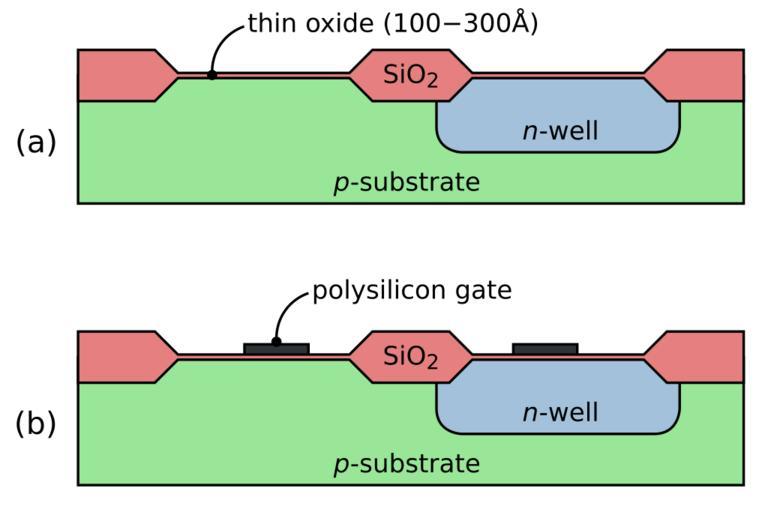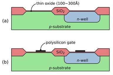 Keywords: MOSFET Manufacture - 3 - polysilicon gate.svg Complementary metal oxide-semiconductor CMOS manufacture process A cross-section of the manufacture of a CMOS inverter <br> Stage 3 Polysilicon gate own 2009-11-16 Inductiveload Own work all rights released Public domain CMOS manufacture |