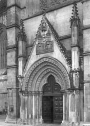 | Keywords: arquitectura gótico portugal batalha mosteiro santa vitória fundação calouste gulbenkian fundaçãocaloustegulbenkian maria pia mariapia mário tavares chicó máriotavareschicó mário novais márionovais gótica biblioteca de arte bibliotecadearte Portal do transepto Fotógrafo: Mário Novais, 1899-1967. Orientador científico: Mário Tavares Chicó, 1905-1966. Data aproximada da produção da fotografia original: 1954. O Mosteiro da Batalha é o mais importante símbolo da Dinastia de Avis. Ele foi construído por iniciativa de D. João I, na sequência de um voto à Virgem, caso vencesse a Batalha de Aljubarrota (1385). Ao longo do século XV, praticamente todos os monarcas aqui deixaram a sua marca. O arranque das obras deu-se em 1388 e foi conduzido por Afonso Domingues, que se manteve à frente do estaleiro até 1402, ano em que faleceu. A ele se atribui o plano geral da construção e o grande avanço dos trabalhos na igreja e no claustro. Não terá tido tempo de executar a fachada principal nem o abobadamento do templo, deixando igualmente inacabado o claustro. A magnífica igreja de três naves e transepto saliente por si delineada, com cabeceira de cinco capelas, sendo a central de duplo tramo e terminação poligonal, terá sido o ponto alto da sua carreira, mas revela bem o nível ainda algo arcaizante da arquitectura portuguesa de finais do século XIV, alheia aos progressos do Gótico Flamejante, que tanto iria marcar a segunda fase do monumento. Com efeito, a partir de 1402, a chefia do estaleiro foi entregue a Huguet, arquitecto de provável origem catalã que inaugurou, entre nós, o tardo-gótico. Documentado à frente do projecto até 1438, a ele se deve o abobadamento dos espaços da igreja e da Sala do Capítulo (onde experimentou, pela primeira vez, uma abóbada estrelada), a construção da Capela do Fundador e, ainda, o início das obras das Capelas Imperfeitas, bem como a conclusão da fachada principal, onde sobressai o portal axial. Este, é delimitado por um arco canopial que integra os escudos de D. João I e de D. Filipa. No tímpano, exibe-se Cristo em Majestade ladeado pelos Evangelistas e as arquivoltas são repletas de figurações que continuam pelas estátuas-colunas, ao abrigo de um complexo programa iconográfico. Mas a mais emblemática obra de Huguet é a Capela do Fundador. Ela foi concebida para panteão régio e sabemos que já se encontrava em obras em 1426. É um compartimento quadrangular que se adossa aos três tramos ocidentais da fachada lateral Sul e integra, ao centro, um esquema octogonal de suportes onde descarrega a abóbada estrelada, solução primeiro experimentada em Inglaterra, mas rapidamente difundida pela Europa. No circuito interior desta capela, colocou-se o túmulo duplo de D. João I e de D. Filipa, realização igualmente sem antecedentes no nosso país e que resulta de uma nítida influência da tumulária inglesa. Na capela repousam também os filhos do casal régio (como D. Henrique e o regente D. Pedro), de acordo com a decisão testamentária de D. João I em fazer deste espaço um efectivo panteão. Em 1436, D. Duarte decidiu edificar uma capela funerária para si próprio. O projecto então concebido por Huguet foi o mais arrojado da sua carreira na Batalha, privilegiando uma planta circular que, todavia, não viria a ser concluída pelo falecimento do mestre dois anos depois. Desta forma, e não obstante a intervenção de Mestre Martim Vasques, a construção cessou até ao reinado de D. Manuel e, mesmo nessa altura, não foi concluída, razão de esta parcela ser conhecida como as Capelas Imperfeitas. No reinado de D. Afonso V, edificou-se o segundo claustro do mosteiro. Ele resulta da intervenção do arquitecto Fernão de Évora e, estilisticamente, é uma obra que contraria o tardo-gótico de raiz flamejante, tendo-se optado deliberadamente pela austeridade arquitectónica, que rejeita até a inclusão de capitéis a marcar o arranque dos arcos. A Batalha teve outras fases construtivas igualmente relevantes, como o Manuelino ou o Renascimento. Todavia, a mudança dinástica verificada com D. Manuel privilegiou outros locais e, só no século XIX, o Mosteiro voltou a ser intervencionado, desta vez com o objectivo de restaurar o conjunto, campanha que se prolongou por meio século. (Fonte: IPPAR - tinyurl.com/5dmlfe) [CFT015.150.ic] Portal do transepto Fotógrafo: Mário Novais, 1899-1967. Orientador científico: Mário Tavares Chicó, 1905-1966. Data aproximada da produção da fotografia original: 1954. O Mosteiro da Batalha é o mais importante símbolo da Dinastia de Avis. Ele foi construído por iniciativa de D. João I, na sequência de um voto à Virgem, caso vencesse a Batalha de Aljubarrota (1385). Ao longo do século XV, praticamente todos os monarcas aqui deixaram a sua marca. O arranque das obras deu-se em 1388 e foi conduzido por Afonso Domingues, que se manteve à frente do estaleiro até 1402, ano em que faleceu. A ele se atribui o plano geral da construção e o grande avanço dos trabalhos na igreja e no claustro. Não terá tido tempo de executar a fachada principal nem o abobadamento do templo, deixando igualmente inacabado o claustro. A magnífica igreja de três naves e transepto saliente por si delineada, com cabeceira de cinco capelas, sendo a central de duplo tramo e terminação poligonal, terá sido o ponto alto da sua carreira, mas revela bem o nível ainda algo arcaizante da arquitectura portuguesa de finais do século XIV, alheia aos progressos do Gótico Flamejante, que tanto iria marcar a segunda fase do monumento. Com efeito, a partir de 1402, a chefia do estaleiro foi entregue a Huguet, arquitecto de provável origem catalã que inaugurou, entre nós, o tardo-gótico. Documentado à frente do projecto até 1438, a ele se deve o abobadamento dos espaços da igreja e da Sala do Capítulo (onde experimentou, pela primeira vez, uma abóbada estrelada), a construç