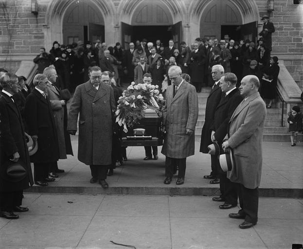 | Keywords: Mother Jones funeral.jpg Photograph en Labor leaders attend Mother Jones funeral Men high in the ranks of labor circles took part in the last rites for Mother Jones 100 year-old labor crusader Standing in the middle of the group of three at the right is William N Doak newly appointed Secretary of Labor The casket is being borne from St Gabriel's Catholic Church in Washington where services were held after which the body was sent to Mount Olivet Ill to be buried beside five of her boys slain there years ago in one of the many labor wars in which she participated This was one of the last requests of the militant laborite whose full name was Mrs Mary Harris Jones but who was known simply as Mother by her thousands of boys throughout the country 12/3/30 LOC-image hec 36112 December 3 1930 1 negative glass 4 x 5 in or smaller accession number LC-DIG-hec-36112 digital file from original negative Call Number LC-H2- B-4319 P P Harris Ewing photographer Rights Advisory No known restrictions on publication Title from unverified caption data on negative or negative sleeve Gift; Harris Ewing Inc 1955 General information about the Harris Ewing Collection is available at http //hdl loc gov/loc pnp/pp hec Mother jones funeral tif yes PD-Harris-Ewing Funerals Category 1930s in Washington D C Mother Jones William N Doak |