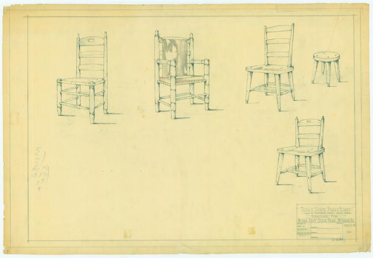 Keywords: mother neff state park motherneffstatepark texas state parks texasstateparks civilian conservation corps civilianconservationcorps ccc sketch drawing text Furniture, including different chairs and one foot stool. Early date: 1934 Late date: 1945 Pencil and colored pencil on paper. Various comments on front and reverse. LN: 37.75 x WD: 25.625 Furniture, including different chairs and one foot stool. Early date: 1934 Late date: 1945 Pencil and colored pencil on paper. Various comments on front and reverse. LN: 37.75 x WD: 25.625 |