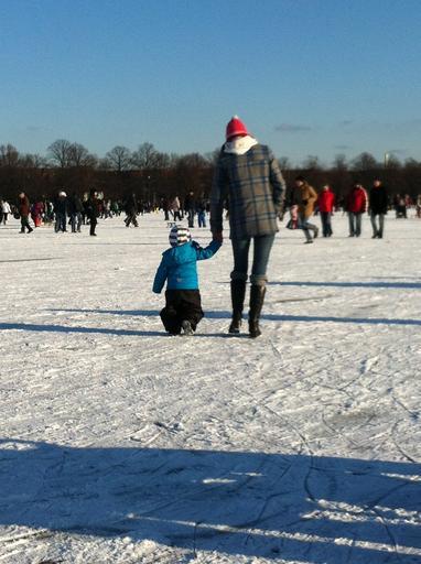 Keywords: mother son child winter ice snow frozen lake winter dream sunshine walk sunday human weekend personal leisure hand lake maschsee cold