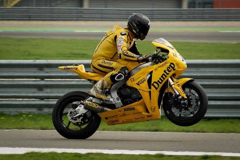 Keywords: motorbike racing bike motorcycle speed motor race bike drive motorsports motoring vehicle yellow racing racer helmet wheelie race track guard rail