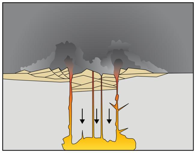 Keywords: Mount Mazama eruption timeline 2.svg Eruptions of ash and pumice The cataclysmic eruption started from a vent on the northeast side of the volcano as a towering column of ash with pyroclastic flows spreading to the northeast </span> Caldera collapse As more magma was erupted cracks opened up around the summit which began to collapse Fountains of pumice and ash surrounded the collapsing summit and pyroclastic flows raced down all sides of the volcano <span style color cccccc; > Steam explosions When the dust had settled the new caldera was 5 miles 8 km in diameter and 1 mile 1 6 km deep Ground water interacted with hot deposits causing explosions of steam and ash Today In the first few hundred years after the cataclysmic eruption renewed eruptions built Wizard Island Merriam Cone and the central platform Water filled the new caldera to form the deepest lake in the United States Figure modified from diagrams on back of 1988 USGS map Crater Lake National Park and Vicinity Oregon </span> http //pubs usgs gov/fs/2002/fs092-02/ U S GEOLOGICAL SURVEY and the NATIONAL PARK SERVICE Nachgebaut von Benedikt Seidl 06-08-2008 Image Mount_Mazama_eruption_timeline PNG SVG Benedikt Seidl Mount_Mazama_eruption_timeline PNG Mount Mazama diagrams Volcanological diagrams Diagrams of calderas |