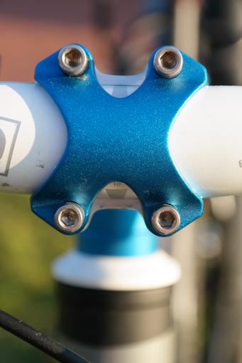 Keywords: mountain bike bike stem handlebar stem handlebars wheel metal blue metallic white screw allen screwed