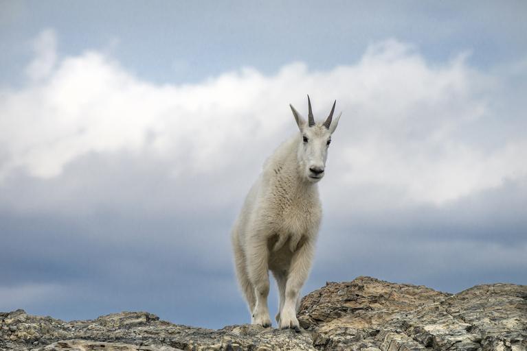 Keywords: mountain goat wildlife nature looking white fur outdoors wild rocks cliff alpine horns animal