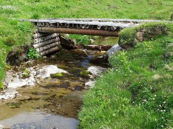 Keywords: mountain stream bridge wooden bridge nature mountain landscape wood tree trunks meadow