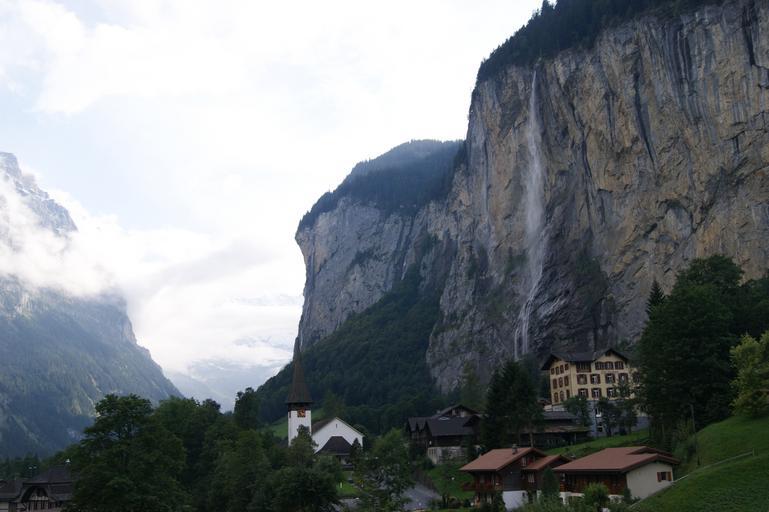 Keywords: mountain switzerland rock waterfall home village sky clouds trees