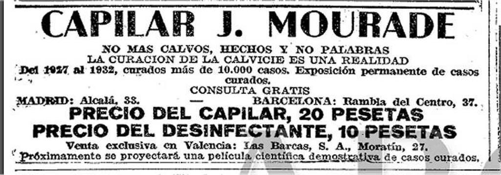 Keywords: Mourade-J-1934-05-27-capilar-J-Mourade.jpg it Capilar Mourade J inserzione del 27 5 1934 su ABC di Siviglia http //hemeroteca abc es/detalle stm ABC Sevilla 27 5 1934 pag 52 ABC Sevilla 1934-05-27 CAPILAR J MOURADE No mas calvos hechos y no palabras La curacion de la calvicie es una realidad Del 1927 al 1932 curados mas de 10 000 casos Exposicion permanente de casos curados CONSULTA GRATIS MADRID Alcalà 33 --- BARCELONA Rambla del Centro 37 PRECIO DEL CAPILAR 20 PESETAS PRECIO DEL DISINFECTANTE 10 PESETAS Venta exclusiva en Valencia Las Barcas S A Moratin 27 Proximamente se proyectarà una pelicula cientifica demostrativa de casos curados PD-old ImageNote 1 21 21 751 257 798 280 2 CAPILAR J MOURADE No mas calvos hechos y no palabras La curacion de la calvicie es una realidad Del 1927 al 1932 curados mas de 10 000 casos Exposicion permanente de casos curados CONSULTA GRATIS MADRID Alcalà 33 --- BARCELONA Rambla del Centro 37 PRECIO DEL CAPILAR 20 PESETAS PRECIO DEL DISINFECTANTE 10 PESETAS Venta exclusiva en Valencia Las Barcas S A Moratin 27 Proximamente se proyectarà una pelicula cientifica demostrativa de casos curados ImageNoteEnd 1 Capilar Mourade J 1934 1934 advertisements in Spain ABC advertisements ABC Sevilla Capilar Mourade J ABC Sevilla |