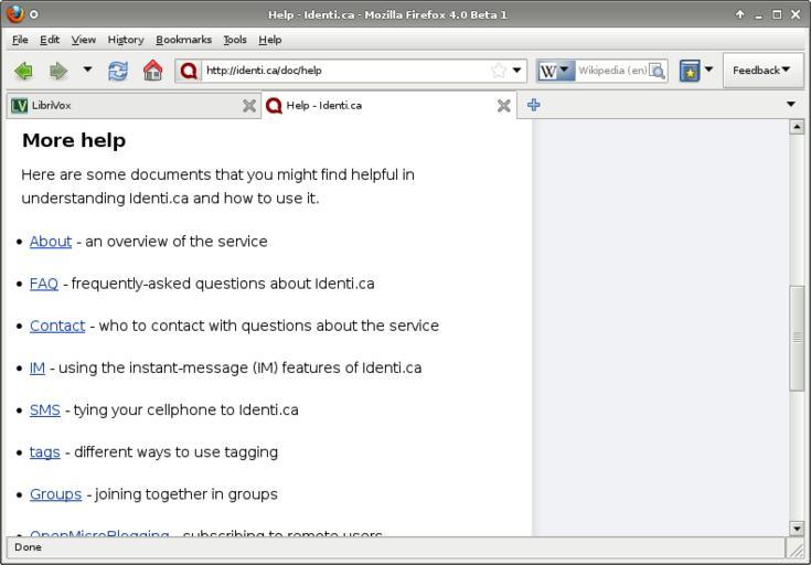 Keywords: Mozilla Firefox 4.0b1 en-US on Debian with Xfce4 smaller.png Screenshot of Mozilla Firefox 4 0 Beta 1 for Linux running on Debian GNU/Linux with Xfce 4 It is displaying an Identi ca help page The left tab has LibriVox loaded Ekrankopio de lang en Mozilla Firefox versio 4 0 Beta 1 por Linukso funkcianta sur Debian GNU/Linux kun Xfce 4 Ä i estas montranta helpopaÄ on de la StatusNeta Identi ca En la maldekstra folio Å argitas LibriVox own <br/> Screenshot 2010-07-07 Mozilla Firefox ”2010 Icons some from the Tango project public domain Identi ca help <br/> Ekrankopio 2010-07-07 Mozilla Firefox ”2010 Bildsimboloj some from the Tango project public domain HelpopaÄ o de Identi ca <br/> Screenshot AVRS Mozilla Firefox Contributors LibriVox icon Identi ca help <br/> Ekrankopio AVRS Mozilla Firefox Mozilo kaj kontribuantoj Bildsimbolo de LibriVox HelpopaÄ o de Identi ca <gallery> File Mozilla Firefox 4 0b1 en-US on Debian with Xfce4 at 1024x768 png LangSwitch As it was opened by Xfce at 1024x768 Kiel la fenestron malfermis Xfce je 1024x768 </gallery> trademarked Firefox The logo http //www mozilla org/foundation/trademarks/ is a trademark La emblemo http //www mozilla org/foundation/trademarks/ estas varmarko MTL trademarked Identi ca cc-by-3 0 LibriVox LibriVox public domain Screenshots of Mozilla Firefox 4 x Screenshots with English Images for Wikinews Identi ca Location not applicable Files by User AVRS/Screenshots/Web |