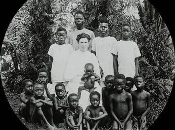 Keywords: Mrs Stannard and group, Congo, ca. 1900-1915 (IMP-CSCNWW33-OS10-63).jpg en <br> Mrs Stannard and group Congo ca 1900-1915 Black and white lantern slide featuring a European female missionary with a group of Congolese small boys and adolescents In consultation with other photographs of the period the female missionary is likely to be a Mrs Stannard A group of small boys sits in front of Mrs Stannard wearing loincloths although two boys wear shirts Mrs Stannard holds a boy baby on her knee Four adolescents - three boys and one girl - stand behind her The group poses in a bushland background This slide comes from a collection generated by missionaries working for the Congo Balolo Mission a mission begun in 1889 under the supervision of the East London Training Institute for Home and Foreign Missions that developed into the interdenominational evangelical mission Regions Beyond Missionary Union after 1900 Photographer Unknown Subject personal name Stannard Filename IMP-CSCNWW33-OS10-63 tif Coverage date 1900/1915 Subject unesco Missionary work Part of collection International Mission Photography Archive ca 1860-ca 1960 Part of subcollection Photographs from the Centre for the Study of World Christianity University of Edinburgh U K ca 1900-ca 1940s Subject corporate name Congo Balolo Mission Repository name Centre for the Study of World Christianity Archival file Volume2/IMP-CSCNWW33-OS10-63 tif Repository address The University of Edinburgh School of Divinity New College Mound Place Edinburgh EH1 2LX United Kingdom Geographic subject country Congo Format aacr2 lantern slides 8 2 x 8 2cm Geographic subject continent Africa Rights Contact the repository for details Part of series Regions Beyond Missionary Union Congo Lantern Slides CSCNWW33/OS10 Repository email divinity-CSWC ed ac uk Date created 1900/1915 Publisher of the digital version University of Southern California Libraries Subject aat genre group portraits Format aat lantern slides; photographs Access conditions http //www ed ac uk/schools-departments/divinity/research/centres/world-christianity/collections-resources Geographic subject educational facilities File CSCNWW33/OS10/63 Subject lcsh Women missionaries; Boys; Portraits group 1900/1915 date created author http //digitallibrary usc edu/cdm/ref/collection/p15799coll123/id/78069 PD-old-70-1923 Magic lantern images Images from USC Digital Library uploaded by Fæ International Mission Photography Archive ca 1860-ca 1960 |