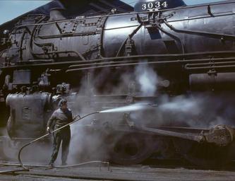 | Keywords: Mrs. Viola Sievers, one of the wipers at the roundhouse.jpg Mrs Viola Sievers one of the wipers at the roundhouse giving a giant Chicago and North Western Railway 'H' class locomotive a bath of live steam Clinton Iowa LOC-image cph 3j00094 1943-04 Creator Jack Delano contrast adjustment color correction PD-USGov 4-8-4 locomotives 1943 in Iowa 1943 in rail transport in the United States Baldwin locomotives Chicago and North Western Railway steam locomotives Clinton Iowa Jack Delano Rail transport staff from the United States Women at work in the United States Women at work in World War II Washing |