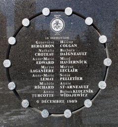 Keywords: Mtl dec6 plaque.jpg أسماء القتلى في المذبحة على النصب التذكاري Památník se jmény obětí útoku Plaque on the exterior wall of École Polytechnique commemorating the victims of the massacre Memorial plate on the side of École Polytechnique Placa conmemorativa a las víctimas École Polytechniquen joukkomurhan uhrien muistomerkki Commémoration des 14 victimes toutes féminines de la tuerie de l'École Polytechnique de Montréal 1989 L'auteur du massacre Marc Lépine déclara « Vous êtes des femmes vous allez devenir des ingénieures Vous n'êtes toutes qu'un tas de féministes je hais les féministes » Selon le documentaire de Patric Jean La Domination masculine 2009 ce massacre a ouvert la parole aux revendications masculinistes au Québec critiquant le sexisme « envers les hommes » Jean-Claude Rochefort auteur de blog sur Internet commémore ce jour comme celui de la Saint-Marc « pour le souvenir de la première contre-attaque contre les féminazies sic dans la guerre contre les hommes » 1 Plaque sur le mur extérieur de l'École Polytechnique commémorant les 14 victimes de la tuerie Memorial ao Massacre da Escola Politécnica de Montreal Katliamın kurbanlarının anısına yapılan ve okulun dış duvarında bulunan bir plaket Katliam anıtı kurbanların anısına self-made derivative of Image 6-dec-Plaque jpg tweaked in photoshop 2007-04-21 Bobanny Monuments and memorials to the École Polytechnique massacre |