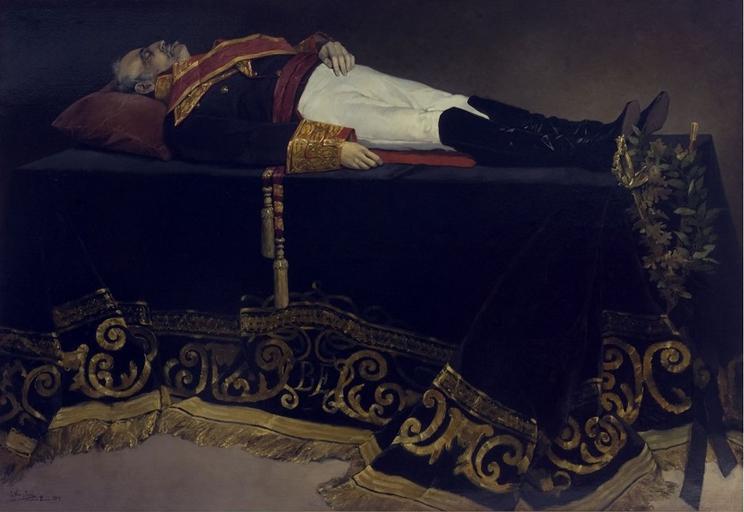 | Keywords: Muerte de Baldomero Espartero (Museo de La Rioja).jpg La obra muestra el cadaver del general y politico español Baldomero Espartero 1793-1879 que fue príncipe de Vergara y regente de España y falleció en la ciudad de Logroño el día 8 de enero de 1879 siendo enterrado en la catedral de Logroño 1879 oil on canvas Size cm Institution Museo de La Rioja http //www museodelarioja es/coleccion/no-se-lo-pierda/ toggle-id-2 accession number http //www museodelarioja es/coleccion/no-se-lo-pierda/ toggle-id-2 PD-old-100 Baldomero Espartero Josep Nin i Tudó Paintings in the Museo de La Rioja 1879 paintings in Spain |