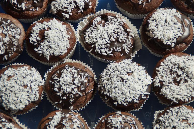 Keywords: muffins schokomuffins delicious confectionery calories treat sweet pastries small cakes sweetness children delicacy benefit from saje candy schokoladenmuffins tart coconut flakes strewn birthday cake fine pastry brown