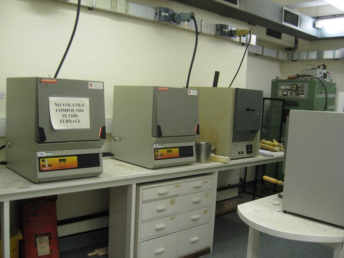 | Keywords: Muffle furnaces.jpg en A row of furnaces in a science laboratory In the foreground are four muffle furnaces three are facing towards the camera and one to the right of the image is facing away The black cables descending from the conduit on the wall are the 415 V power cables which supply the furnaces The maximum temperature of these furnaces is approximately 1400 °C In the far corner of the room part of an induction furnace is visible The wooden handle visible near the muffle furnace facing away from the camera belongs to a set of metal tongs used to handle hot crucibles 2011-12-09 own Brammers cc-zero Uploaded with UploadWizard Furnaces Scientific equipment |