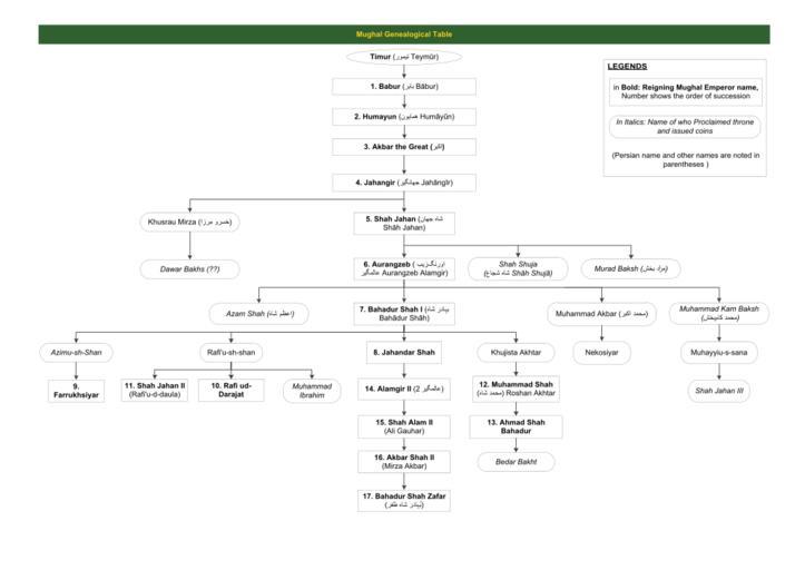 Keywords: Mughal Genealogical Table.svg MIRZA AZAM alijah s/o Aurangzeb Subah BERAR Duccun _______________ JAHAN ZEB BANU MOTHER d/o DaraShikoh NadiraBanu ______ BEDAR BAKHT MIRZA JAWAN BAKHT SIKANDARSHAN MIRZA NAJIBUNNISA BEUM MIRZA FEROZ BAKHT ADLI BEG _______________________________ BULAQI BEG MIRZA ATIU BEG MIRZA ____________________________ ADULI BEGMIRZ GULAAQI BEG MIRZA ________________________ SARDAR BEG MIRZA QADAR BEG MIRZA ____________ _________________ UMRAO BEG MIRZA HATAMBEG MIRZA HASAN BEG MIRZA MEHBOOB BEG MIRZA_______________________________ QADAR BEG MIRZA ROSHAN BEG MIRZA _________ ______________________________________________________ CHAND BEG MIRZA RAHMAN BEG MIRZA ALAM BEG MIRZA MUQADDER BEG Mirza en List of Mughal Emperors and claimants Succession order in numerals Tree shows genealogical ancestry own Nafsadh 2011-03-29 Made as a replacement of http //en wikipedia org/wiki/File Mughal_Genealogical_Table gif Info taken from Wikipedia articles and previous image which took information from page XVI of Catalogue of Coins in Punjab Museum Lahore Museum Lahore 1914 by R B Whitwhead The book is the public domain so this image is as well cite book Whitehead Richard Bertram Catalogue of Coins in the Panjab Museum Lahore Indo-Greek Coins Volume 1 http //www archive org/stream/catalogueofcoins01lahouoft page/n3/mode/2up 1914 The Panjab Government at The Clarendon Press Oxford People of the Mughal Empire |