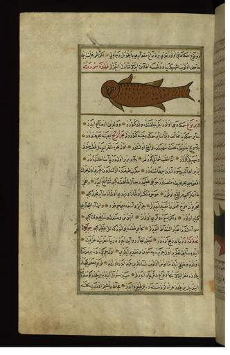 | Keywords: Muhammad ibn Muhammad Shakir Ruzmah-'i Nathani - A Fish with the Head of an Owl - Walters W659161A - Full Page.jpg Muhammad ibn Muhammad Shakir Ruzmah-'i Nathani - A Huge Fish - Walters W659160B - Full Page jpg Muhammad ibn Muhammad Shakir Ruzmah-'i Nathani - A Sick Person and Creatures of Saksar Island - Walters W659163A - Full Page jpg rtl Walters Art Museum artwork Creator Zakariya al-Qazwini This folio from Walters manuscript W 659 depicts a fish with the head of an owl islamic 1717 1121 Ottoman ink pigments paper <br/> ink and pigments on European laid paper cm 33 20 accession number W 659 161A 84072 Henry Walters Baltimore date and mode of acquisition unknown Walters Art Museum Henry Walters Acquired by Henry Walters place of origin Turkey Walters Art Museum license 2D Bestiary by Zakariya al-Qazwini Walters MS 659 161A Media contributed by the Walters Art Museum needs category review |