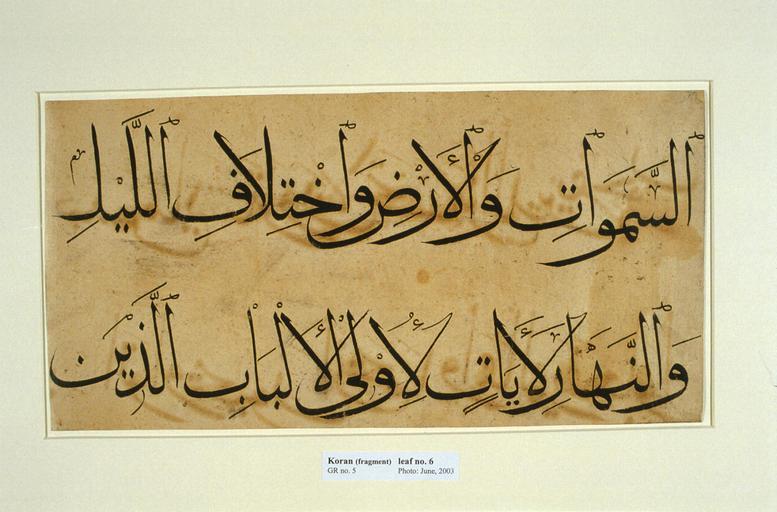 | Keywords: Muhaqqaq script - Qur'anic verses.jpg en Parts of verses 190-191 of the 3rd chapter of the Qur'an entitled Surat Al 'Imran The Family of 'Imran The text is executed in a crisp and fully vocalized muhaqqaq script on a light beige paper and may have been executed in Persia or Central Asia during the early 15th century LOC-calligraphy ascs 284 Unknown Calligrapher century 15 PD-Art Muhaqqaq style Qur'an manuscripts 15th century Library of Congress Arabic Persian and Ottoman calligraphy collection |