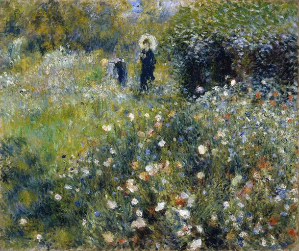 Keywords: Mujer con sombrilla en un jardín.jpg Artwork Creator Pierre-Auguste Renoir En esta Mujer con sombrilla en un jardín Renoir adopta un lenguaje plenamente impresionista Además de suprimir el horizonte utiliza un modo de pintar las flores y los matorrales del jardín a base de pequeños toques de color que crean un juego de texturas continuo que envuelve a las dos pequeñas figuras de la composición Junto a la mujer que se protege del sol con una sombrilla aparece una figura masculina agachada quizás recogiendo una flor cuya proximidad hace suponer que existe entre ellos algún tipo de relación El cuadro no fue pintado en el campo sino en el jardín del nuevo estudio del pintor en Montmartre Su amigo George Riviére recordaba En cuanto Renoir entró en la casa se sintió fascinado por la vista del jardín que parecía un bello y abandonado parque <ref>http //www museothyssen org/thyssen/zoom_obra/832 museothyssen org</ref> reflist ca 1876 oil canvas cm 54 5 65 Institution Museo Thyssen-Bornemisza Madrid accession number http //www museothyssen org/thyssen/zoom_obra/832 Nº INV 724 1974 43 object history credit line Colección Carmen Thyssen Bornemisza PD-old-auto 1919 Paintings in the Thyssen-Bornemisza Museum Paintings by Pierre-Auguste Renoir |