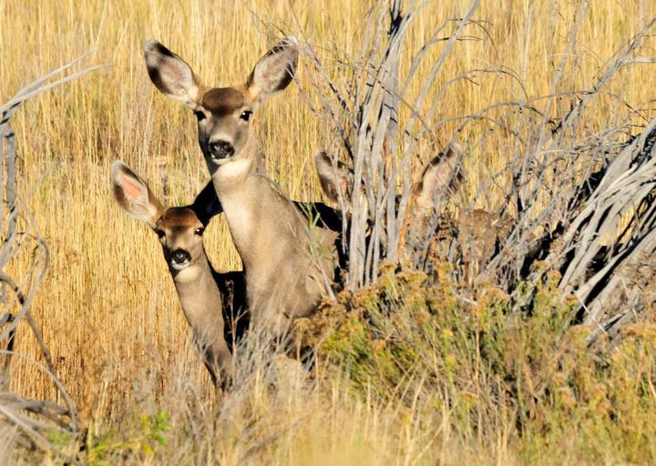 Keywords: mule deer doe fawn wildlife nature ears grass prairie wilderness looking portrait