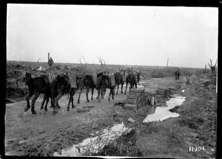 | Keywords: blackandwhite monochrome outdoor photo border animal black and white Pairs of mules carrying ammunition for New Zealand artillery on the Ypres Salient during World War I. The shells are contained in divided bags. Each pack mule carries four shells on each side. Shows the wet conditions in the area. The mule track is muddy and there are pools of water on either side. Photograph taken Kansas Farm 12 October 1917 by Henry Armytage Sanders. Inscriptions: Inscribed - Photographer's title on negative -bottom right: H0301. Quantity: 1 b&w original negative(s). Physical Description: Dry plate glass negative 4.75 x 6.5 inches Mules carrying ammunition to the New Zealand guns on the Western Front, World War I. Royal New Zealand Returned and Services' Association :New Zealand official negatives, World War 1914-1918. Ref: 1/2-012944-G. Alexander Turnbull Library, Wellington, New Zealand. natlib.govt.nz/records/22762316 Pairs of mules carrying ammunition for New Zealand artillery on the Ypres Salient during World War I. The shells are contained in divided bags. Each pack mule carries four shells on each side. Shows the wet conditions in the area. The mule track is muddy and there are pools of water on either side. Photograph taken Kansas Farm 12 October 1917 by Henry Armytage Sanders. Inscriptions: Inscribed - Photographer's title on negative -bottom right: H0301. Quantity: 1 b&w original negative(s). Physical Description: Dry plate glass negative 4.75 x 6.5 inches Mules carrying ammunition to the New Zealand guns on the Western Front, World War I. Royal New Zealand Returned and Services' Association :New Zealand official negatives, World War 1914-1918. Ref: 1/2-012944-G. Alexander Turnbull Library, Wellington, New Zealand. natlib.govt.nz/records/22762316 |
