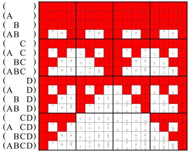 Keywords: Multigrade operator all or nothing.svg The multigrade operation all or nothing of the arguments in the parentheses to the left of the matrix Red squares stand for binary ones respectively for true 146 of 256 squares are red All or nothing means AND <small>OR</small> NOR 150px <math>~\or~</math> 150px <math>~\Leftrightarrow~</math> 150px Apart from the line with no arguments it's the same as AND <small>XOR</small> NOR 150px <math>~\oplus~</math> 150px <math>~\Leftrightarrow~</math> 150px own 2010 Mate2code Related files User Boolean Algebra/Multigrade operator examples <br clear all> Truth tables Binary square matrices in logic |