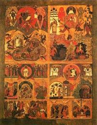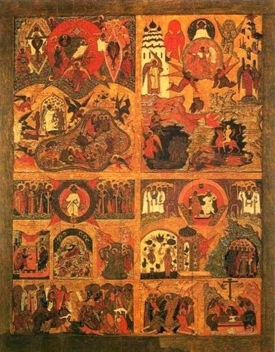 Keywords: Multiple icon (Annunciation Cathedral in Moscow).jpeg Четы ехчастная икона Иконописцы Останя Яков Якушко н зб Се Высокий Глаголь Псков 1547-1551 Когда после пожа а 1547 года началось восстановление Благовещенского собо а новые иконы для него были заказаны новго одским и псковским масте ам В овго од заказали Т оицу Живоначальную в деяниях Символ Ве ы Хвалите Господа с небес София П емуд ость Божия и Достойно есть Псковичами были написаны иконы Ст ашный Суд Обновление х ама Х иста Бога нашего Воск есения Ст асти Господни в евангельских п итчах и Четы ехчастная К сожалению до нашего в емени сох анились лишь Четы ехчастная и Ст ашный Суд Поскольку псковская иконопись издавна отличалась своеоб азием была достаточно отк ыта для азно одных западных воздействий то как аз в ней п оявились новые иконописные тенденции г озненского в емени Четы е обособленные части иллюст и уют богословскую концепцию п едвечного замысла о тва и согласно кото ой Воплощение Х иста и Его искупительная же тва были п едоп еделены Божественным п омыслом еще в момент создания ми а п ежде создания Адама п ежде п она ечась Воплощение Х истово яко Едино одному Сыну животво ящим к естом ада азо ити и и диавола связати и тако всему ми у спасение соделати ит ополит ака ий Ве хняя левая часть иконы называется И почи Бог в день седьмый Быт 2 2 Слева на ней - иконог афический ва иант овозаветной Т оицы известной под названием Х истос аспятый в лоне Отчем Инте есно что в каждой из 4-х частей п исутствует изоб ажение Т оицы овозаветной в том или ином ва ианте Ангел Великого Совета Отечество Соп естолие Это гово ит нам о той оли кото ую в деле домост оительства отводили Св Т оице изог афы и богословы Также в левой части изоб ажены сюжеты из Книги Бытия Властелин Вселенной поставил созданного Им и по Его об азу человека владыкой земли и всего что наполняет ее и дал человеку все возможности уподобиться своему Тво цу И благословил Бог седьмой день и освятил его ибо в оный почил от всех дел Своих кото ые Бог тво ил и созидал Быт 2 3 Бог весь этот длинный седьмой день кото ый еще до сих по не закончился посвятил исключительно человеку Осознавая это человек тоже должен к седьмому дню недели закончить все дела свои кото ыми он занимался в течение шести дней благословить день седьмой и освятить его т е посвятить его Богу Вто ая композиция - слева внизу - называется П иидите Т исоставному Божеству поклонимся Здесь аск ывается тема Боговоплощения че ез конк етные Евангельские события - Благовещение Рождество Х истово К ещение аве ху как мы уже замечали на иконах Пок ова Бого одице - сонм ангельских сил внизу - все земные святые чины Т етий извод - п авый снизу - посвящен человеческому спасению сове шившемуся благода я искупительной же тве Х иста Его название - Во г обе плотски - иллюст и ует текст кондака пасхального канона а ней мы видим известные иконог афические сюжеты - Сошествие во ад и Положение во г об об аз Рая - Ца ства ебесного и ждущих избавления от сени сме тныя святых и п аведников http //www cirota ru/forum/view php subj 47937 fullview 1 order asc Псков 1547-1551 Иконописцы Останя Яков Якушко н зб Се Высокий Глаголь Multiple-images marian icons Main iconostasis of Annunciation Cathedral in Moscow Files uploaded by Shakko from various sources PD-Art