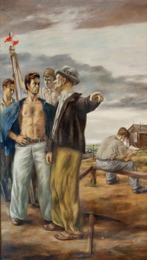Keywords: Mural-Ariel-Rios-Brook-2.jpg en Photograph of mural Reading the family letter by Alexander Brook at the Ariel Rios Federal Building in Washington D C <br>Notes Date 1939; dimensions 11' 2 x 6' 3 Photographed as part of an assignment for the General Services Administration Title date and keywords from information provided by the photographer Credit line Photographs in the Carol M Highsmith Archive Library of Congress Prints and Photographs Division Gift; Carol M Highsmith; 2009; DLC/PP-2009 083 Forms part of Photographs in the Carol M Highsmith Archive Mural information from the http //m gsa gov/m/vpb/01028/art_15 html General Services Administration<br>In Reading the Family Letter Brook depicts the mail's role in helping to alleviate the loneliness and homesickness experienced by young men working far from home during the Depression The picture shows five CCC men who would have lived together in military-style camps and worked in teams planting trees maintaining roads and preserving wildlife The bare chest of one worker signals the strength and fortitude required to perform eight hours of manual labor each day and reinforces the heroic image of CCC workers The man featured in the right half of the composition however retreats from his companions to read a letter from his family His intense focus on the letter shows an eagerness for any news from his family As CCC worker Belden Lewis described in his 1934 “35 diary receiving a letter from home was often the highlight of a worker's day <br>Alexander Brook is one of eleven artists whose murals are featured in the William Jefferson Clinton Federal Building Brook's murals located in the lobby of the Benjamin Franklin U S Post Office are the only pair that is completely accessible to the public LOC-image highsm 24915 Creator Carol M Highsmith 2011-09 PD-Highsmith Ariel Rios Federal Building mural photographs by Carol M Highsmith |
