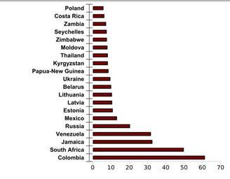 Keywords: Murder per capita by country.svg en Murders per capita 1998 - 2000 by country Source http //www nationmaster com/red/graph/cri_mur_percap-crime-murders-per-capita int -1 Murders per capita 1998 - 2000 by country sur nationmaster com Own Urban 2009-04-20 File Taux de meurtres svg Homicide rates Crime statistics |