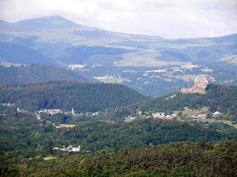 | Keywords: Murol Château12.JPG fr Murol comm du Puy-de-Dôme Auvergne France à droite Château de Murol ; à gauche bourg de Murol visible partiellement avec son clocher Tout au fond massif du Sancy Plus près de nous en bas à gauche hameau de Sapchat comm de saint-Nectaire Photographie prise au téléobjectif à env 4 km à vol d'oiseau de distance du château de Murol depuis les hauteurs à l'est de Saint-Nectaire Coup d'œil vers l'ouest-sud-ouest self-photographed Torsade de Pointes 2011-07 Remote views of château de Murol Cc-zero |