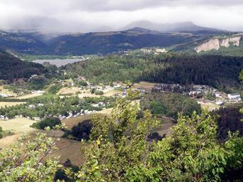 Keywords: Murol Vue générale5.JPG fr Murol comm du Puy-de-Dôme Auvergne France En contrebas à gauche quartier des Fougeoles le vieux bourg de Murol situé plus à droite c -à -d plus au nord-est se trouve hors du cadre de la photo à l'arrière-plan à droite falaises de la Dent du Marais commune de Chambon-sur-Lac Le plan d'eau à gauche est le lac de Chambon vue partielle dont l'extrémité est appartient à la commune de Murol Tout au fond le massif du Sancy voilé de brouillard Photographie prise depuis le flanc ouest à 1020 m d'alt du Puy de Bessolles à quelque 1100 m du village de Murol Coup d'oeil vers l'ouest-nord-ouest self-photographed Torsade de Pointes 2011-07 Murol Cc-zero |