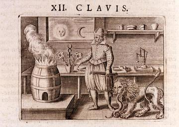 | Keywords: Musaeum Hermeticum 1678 XII. Clavis AQ40 Key 12.tif Matthaeus Merian 1593 “1650 From Tripus aureus hoc est Tres tractatus chymici selectissimi nempe I Basilii Valentini benedictini ordinis monachi Germani practica una cum 12 clavibus et appendice ex germanico; II Thomae Nortoni angli philosophi crede mihi seu ordinale ante annos 140 ab authore seriptum nunc ex anglicano manuscripto in latinum translatum phrasi eujusque authoris ut et sententia retenta; III Cremeri cuiusdam abbatis westmonasteriensis angli testamentum hactenus nondum publicatum nunc in diversarum nationum gratiam editi et figuris cupro affabre incisis ornati operâ et studio Michaelis Maieri phil et med d com p c Francofurti apud Hermannum à Sande MDCLXXVII as published in the collection Musaeum hermeticum reformatum et amplificatum Francofurti Apud Hermannum à Sande 1678 In Latin The part in question 'I Basilii Valentini benedictini ordinis monachi Germani practica una cum 12 clavibus et appendice ex germanico;' or 'Basil Valentine a German monk of the Benedictine order one study with the twelve keys and the appendix translated from the German ' Inside a laboratory an alchemist stands holding tongs in his left hand With his right hand he points to a triangular crucible set on a bench with the symbol of Mercury above it from which grow two rose-like flowers Through an open window behind the crucibe the Sun and Moon can be seen To the alchemist's left is a large barrel-shaped furnace from the top of which come flames and smoke To his right are shelves with instruments and books Below them a lion holds the head of a snake in its jaws http //othmerlib chemheritage org/record b1035996~S6 Catalog Information From the copy in the Roy G Neville Historical Chemical Library http //www chemheritage org/ Chemical Heritage Foundation Downloaded with permission from the Chemical Heritage Foundation as part of the Wikipedian in Residence initiative Chemical Heritage Foundation http //www chemheritage org/ Chemical Heritage Foundation 1678 PD-old-100 PD-old-100 cc-by-3 0 Chemical Heritage Foundation Musaeum Hermeticum Archives Images from the Chemical Heritage Foundation Twelve Keys of Basil Valentine PD-old-100 |